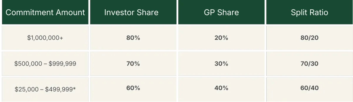At Ironleaf, we believe a successful partnership is rooted in a clear, performance-driven allocation of profits. Our incentive structure is designed to reward larger capital commitments with a greater share of the upside, while ensuring our team remains focused on long-term value creation.